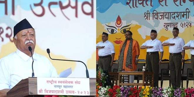 विजयदशमी पर राष्ट्रीय स्वयंसेवक संघ प्रमुख मोहन भागवत ने लोगों को संबोधित कर कहा- हर साल हम दुनिया भर में भारत की छवि को बढ़ते हुए देख रहे हैं। हम हर वर्ष विजयादशमी को शक्ति के उत्सव (शक्ति-पर्व) के रूप में मनाते हैं। इस वर्ष यह त्योहार हम सभी के लिए गर्व, खुशी और उत्साहजनक घटनाएं लेकर आया है। जी-20 – भारतीयों के आत्मीय आतिथ्य का अनुभव, भारत का गौरवशाली अतीत तथा वर्तमान की उमंगभरी उड़ान सभी देशों के सहभागियों को प्रभावित कर गई। पिछले वर्ष, भरत ने जी-20 के अध्यक्ष के रूप में मेजबान की भूमिका निभाई। लोगों द्वारा किए गए गर्मजोशी भरे आतिथ्य के अनुभव, भारत के गौरवशाली अतीत, चल रही रोमांचक विकास यात्रा ने सभी देशों के प्रतिभागियों को बहुत प्रभावित किया। भारत की विशिष्ट सोच और दृष्टि के कारण हमारा ‘वसुधैव कुटुम्बकम्’ का मार्गदर्शक सिद्धांत अब पूरे विश्व के दर्शन में समाहित हो गया है।