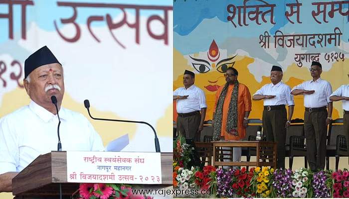 महाराष्‍ट्र, भारत। विजयदशमी के अवसर पर नागपुर के रेशिमबाग मैदान में राष्ट्रीय स्वयंसेवक संघ (RSS) के मुख्यालय नागपुर में स्थापना दिवस और शस्त्र पूजन कार्यक्रम का आयोजन हुआ। इस मौके पर विजयादशमी उत्सव 2023 के कार्यक्रम को राष्ट्रीय स्वयंसेवक संघ प्रमुख मोहन भागवत ने लोगों को