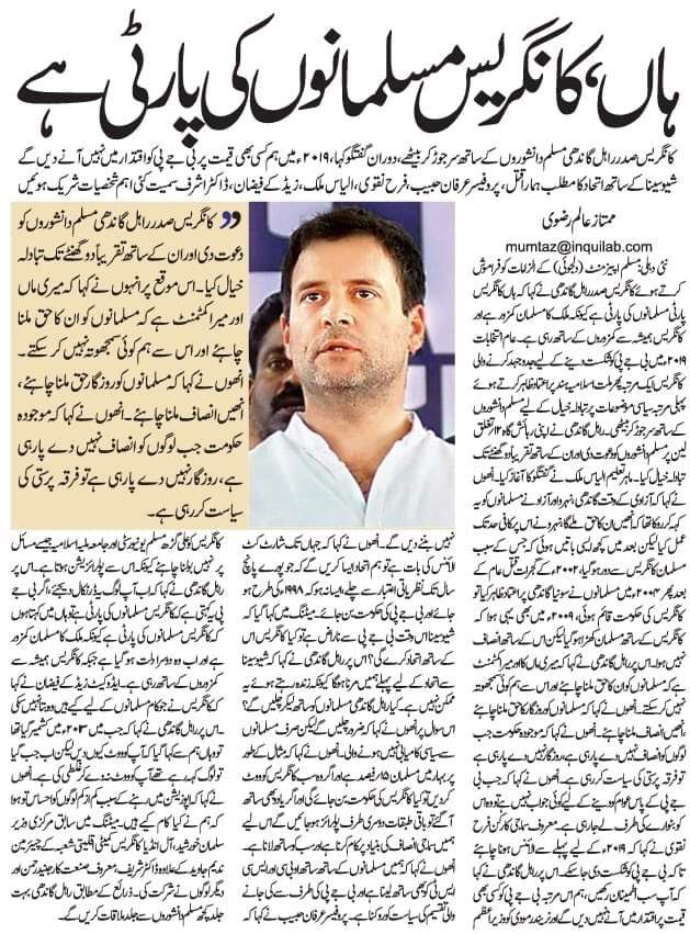 इंक़लाब अख़बार में प्रकाशित रिपोर्ट: इंकलाब के मुताबिक राहुल गांधी ने कहा, ‘अगर भाजपा यह कहती है कि कांग्रेस मुसलमानों की पार्टी है तो हां मैं कहता हूं कि कांग्रेस मुसलमानों की पार्टी है, क्योंकि मुल्क का मुसलमान अब दूसरा दलित हो गया है, जबकि कांग्रेस हमेशा से कमजोरों के साथ रही है.’