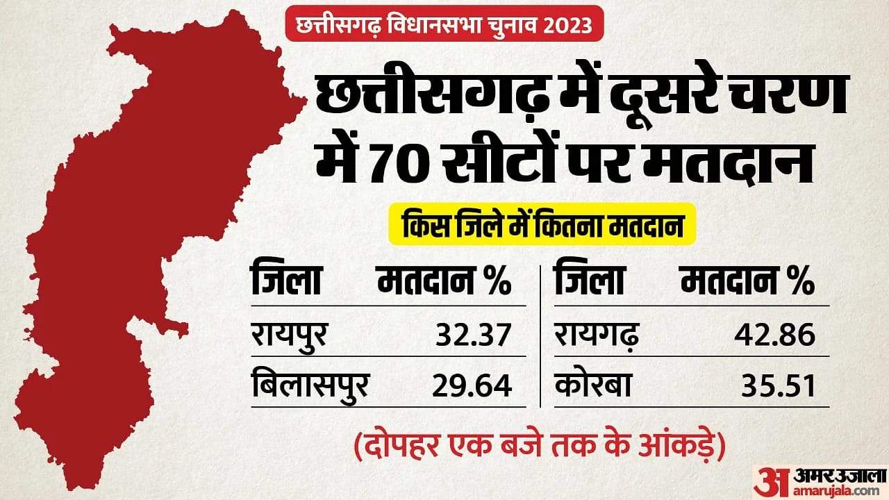 रायपुर की सात विधानसभा सीटों पर एक बजे तक 32.37 प्रतिशत मतदान हो चुका है। मतदाता मतदान करने पोलिंग बूथ पहुंच रहे हैं।