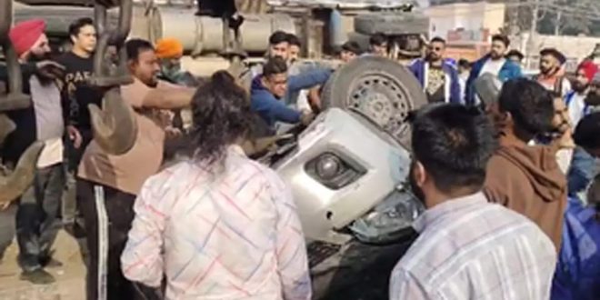 जालंधर। पंजाब में जालंधर जिले के पठानकोट बाईपास के पास सोमवार को भीषण सड़क हादसे में चार लोगों की मौत हो गई। जबकि हादसे में घायल हुए दो लोगों को इलाज के लिए अस्पताल पहुंचाया गया है। मीडिया रिपोर्ट के अनुसार, हाईवे पर ट्रक और कार के बीच जोरदार टक्कर हो गई। टक्कर के बाद ट्रक हाईवे पर पलट गया। इस हादसे में चार लोगों की मौत हो गई। हादसा इतना भीषण था कि क्रेन की मदद से गाड़ी को सीधा किया गया और गाड़ी को काटकर मृतकों को बाहर निकाला गया। कार पूरी तरह से क्षतिग्रस्त हो गई है।