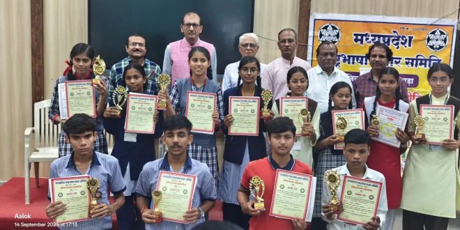 छिन्दवाड़ा। मध्यप्रदेश हिन्दी राष्ट्रभाषा प्रचार समिति छिंदवाड़ा इकाई द्वारा आयोजित 21वीं जिला स्तरीय प्रतिभा प्रोत्साहन प्रतियोगिता गत दिवस शासकीय उत्कृष्ट विद्यालय छिंदवाड़ा में संपन्न हुई। इस प्रतियोगिता के अंतर्गत लगभग 20 शालाओं के 150 से अधिक विद्यार्थियों ने काव्य पाठ प्रतियोगिता, भाषण प्रतियोगिता, एकल लोकगीत गायन प्रतियोगिता और चित्रांकन से शब्दांकन प्रतियोगिता में सहभागिता की जिसमें से सभी वर्गों में विजेता विद्यार्थियों को प्रथम, द्वितीय व तृतीय पुरस्कार के रूप में समिति द्वारा नगद राशि, प्रतीक चिन्ह व प्रमाण पत्र वितरित करने के साथ ही सभी प्रतिभागी विद्यार्थियों को प्रमाण पत्र वितरित किए गए। कार्यक्रम के मुख्य अतिथि आकाशवाणी छिंदवाड़ा के पूर्व निदेशक डॉ. हरीश पाराशर रिशु थे तथा कार्यक्रम की अध्यक्षता वरिष्ठ साहित्यकार श्री सुरेन्द्र वर्मा ने की। कार्यक्रम में जिला शिक्षा अधिकारी श्री जी.एस.बघेल विशेष अतिथि और डॉ.अमरसिंह व जी.एस.कॉलेज नागपुर से पधारे प्रो. हर्षद घाटोले विशेष अतिथि वक्ता के रूप में उपस्थित थे। समिति के अध्यक्ष श्री गोवर्धन यादव के मार्गदर्शन में संपन्न इस कार्यक्रम का संचालन वरिष्ठ साहित्यकार श्री ओमप्रकाश “नयन” के साथ ही श्री आलोक यादव व श्रीमती शैली यादव ने किया।