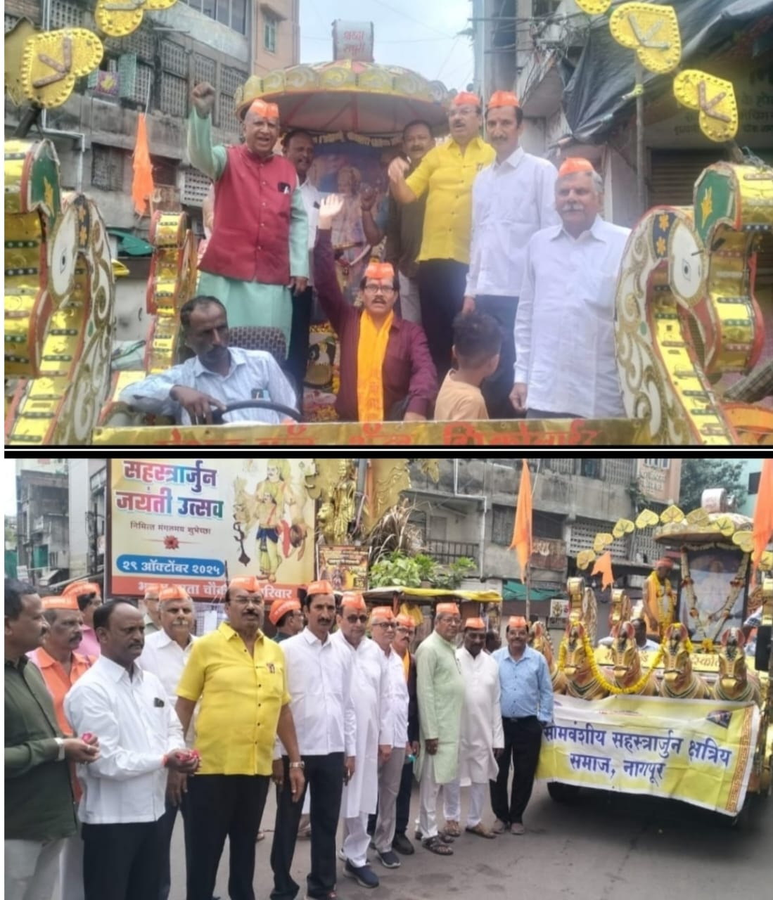 कार्तिक शुक्ल पक्ष सप्तमीला भगवान सहस्त्रार्जुन जन्मोत्सव संपुर्ण देशभरात मोठ्या उत्साहाने साजरा करण्यात आला. त्याच अनूषंगाने दिनांक २९ आक्टोंबर २०२५ कार्तिक शुक्ल पक्ष सप्तमीला भगवान सहस्त्रार्जुन जन्मोत्सवानिमित्त नागपूर येथे भव्य शोभायात्रा काढण्यात आली.हि शोभायात्रा गोलीबार चौक येथुन प्रारंभ होऊन गांजाखेत चौक,गांधीबाग गार्डन, तीननल चौक,भारत माता चौक,नंगापुतळा चौक या परीसरातुन वाजतगाजत नेण्यात आली यावेळी समाजाच्या अनेक भक्तांनी झांकीवर फुलांचा वर्षाव करून भगवान सहस्त्रार्जुन यांना नमन केले व सर्वत्र उत्साहाचे वातावरण निर्माण झाले आणि या शोभायात्रेचे समापन गोलीबार चौक येथे करण्यात आले. अखिल भारतीय सर्ववर्गीय कलार समाज नागपुर,सोमवंशीय सहस्रार्जुन क्षत्रिय समाज नागपुर, महाराष्ट्र कलाल-कलार समाज संघटना नागपूर एवं सहस्रबाहु संदेश परिवार नागपुर इत्यादी अनेक संघटनेचे समाज बांधव या शोभायात्रेत मोठ्या संख्येने उपस्थित होते.सर्ववर्गिय कलार समाज के अध्यक्ष भूषण दडवे, सोमवंशीय समाज के संरक्षक डाॅ सुभाष राऊत, महाराष्ट्र कलाल-कलार समाजाचे राज्य प्रवक्ता (पत्रकार) रमेश लांजेवार इत्यादीसह समाजाचे अनेक मान्यवर प्रामुख्याने उपस्थित होते.या शोभायात्रे दरम्यान डाॅ सुभाष राऊत यांनी संयुक्त आयोजन व एकतेवर जोर दिला,भूषण दडवेनी नागपुर शहरातील एखाद्या चौकाला भगवान सहस्रबाहु नाव देण्यावर भर दिला तर रमेश लांजेवार यांनी संपूर्ण शाखेतील समाजबांधवांना एकत्र करण्यावर भर दिला. शोभायात्रेमध्ये प्रामुख्याने किशोर पालांदुरकर,रमेश जायसवाल, दीपक वालोदे, दुर्गाप्रसाद चौरागडे, महेन्द्र डोहरे, अरविंद राय,उमेश चौकसे,अनिल मानापुरे,राजेन्द्र राय,देवेन्द्र राय,दिनेश परिहार,अभय राऊत,मिलींद मानापुरे,किशोर दहीकर,शेखर डोरलीकर राकेश जायसवाल,विजय दहीकर, मदनसा रतन, राकेश चव्हाण, पंकज दहिकर,प्रणाली चव्हाटे, सौ अनिता नाकोड,श्रध्दा परिहार, वैशाली मामर्डे, सौ कुमुदिनी बारड,श्रीमती इंदिरा पवार, गजानन पटले,धर्मराज नाकोड, दिलीप राऊत, बलवंत चव्हाटे आदीसह शेकडोंच्या संख्येने अनेक समाजबांधव व भगिनी मोठ्या संख्येने उपस्थित होते.