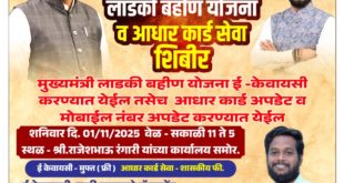 महादुला में आज CM लाडली योजना आधार कार्ड शिबीर टेकचंद्र शास्त्री: 9822550220 नागपूर जिला कामठी तहसील के देवी मंदिर रोड महादुला पंचशील भवन प्रांगण राजेश रंगारी निवास परिसर मे CM लाडली बहना अधार कार्ड सेवा शिविर आयोजित है . मुख्यमंत्री लाड़ली बहना योजना के लिए आधार कार्ड ई-केवाईसी (e-KYC) सुनिश्चित करने के लिए,समस्त महिलाओं को अपनी समग्र आईडी …